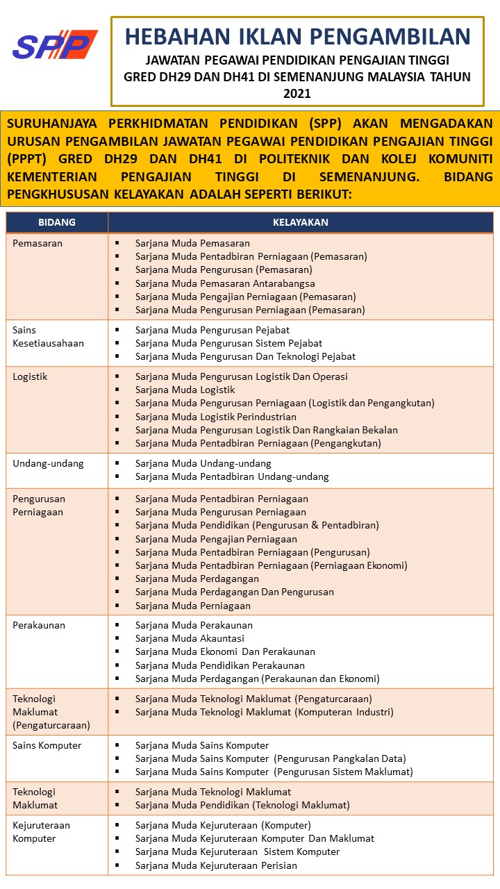 Spp Malaysia On Twitter Hebahan Iklan Pengambilan Jawatan Pegawai Pendidikan Pengajian Tinggi Gred Dh29 Dan Dh41 Di Semenanjung Malaysia Tahun 2021 Permohonan Hendaklah Dikemukakan Secara Dalam Talian Melalui Portal Https T Co Cqcdzjrq1w Dan Tarikh